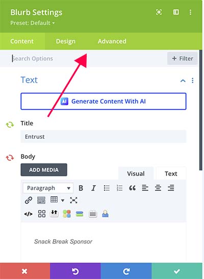 Open the settings if you need to make changes. If the content you need to adjust has green arrows but you only want it to change on this module, then make sure to click the arrow to make it red before you change the content.