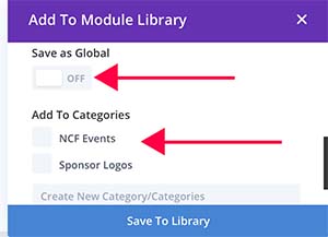 Scroll down and turn on the “Save as Global” toggle. Add the element to a Category or create a new one if necessary. Again, these will be how you search for the element in the future. Click Save to Library.