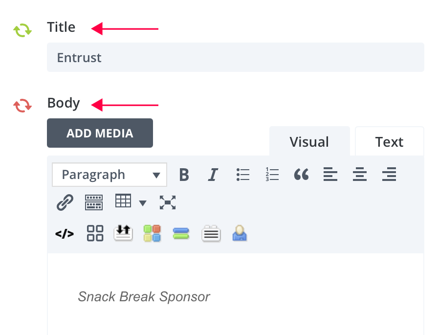 When the arrows are red this setting is NOT global and can be changed without affecting the rest of the website. An example of this is changing the sponsorship level for the sponsor icons. The icons and company name will stay the same but the sponsorship level can be different from event to event.