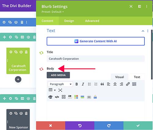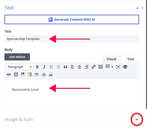 Open the settings and make sure the arrows next to the body content are red. If not, click them to make them red. Add the type of sponsorship to the body content and click the green checkmark to save.