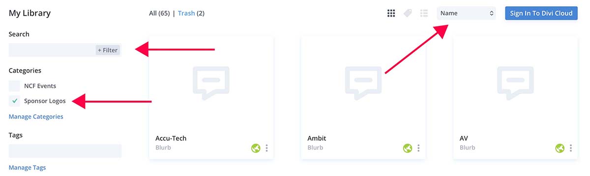 From the Library selection page search for a company/logo or select the Sponsor Logos category to refine the results. By default the company/logos will be ordered by the date they were created but you can select by “Name” in the sort options.